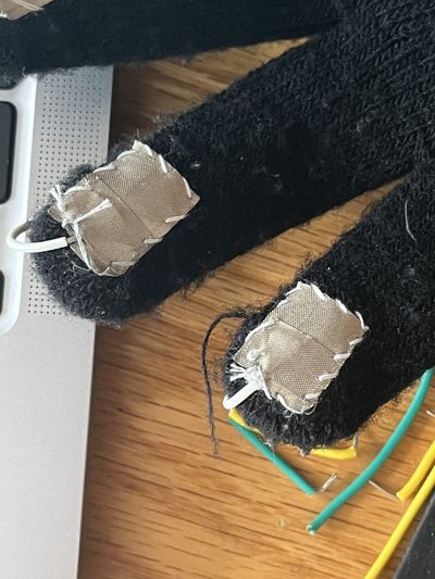 works on thumb-to-finger contact. conductive fabric is sewn onto the pads of the fingers and thumb. each finger is connected to a control pin, and the thumb is connected to ground. while the exposed conductive surfaces aren't ideal, i found that using pull-up resistors effectively limits the range of valid signal strengths for a closed connection, and normal stage equipment—mic chassis, metal stands, macbook shells—did not cause unwanted connections.